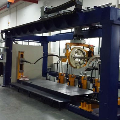 包帶頭安裝于移動式龍門上,可在寬度方向(Y軸)及高度方向(Z軸)自動移動并隨龍門實現(xiàn)長度方向(X軸)移動。總機(jī)由六個控制軸聯(lián)動控制以實現(xiàn)對三維線棒的最佳絕緣包帶。包帶頭進(jìn)行了平衡設(shè)計以保證高速包帶時的穩(wěn)定性,可實現(xiàn)1盤包帶或2盤包帶,包帶張力可根據(jù)需要設(shè)定并實現(xiàn)恒張力。
